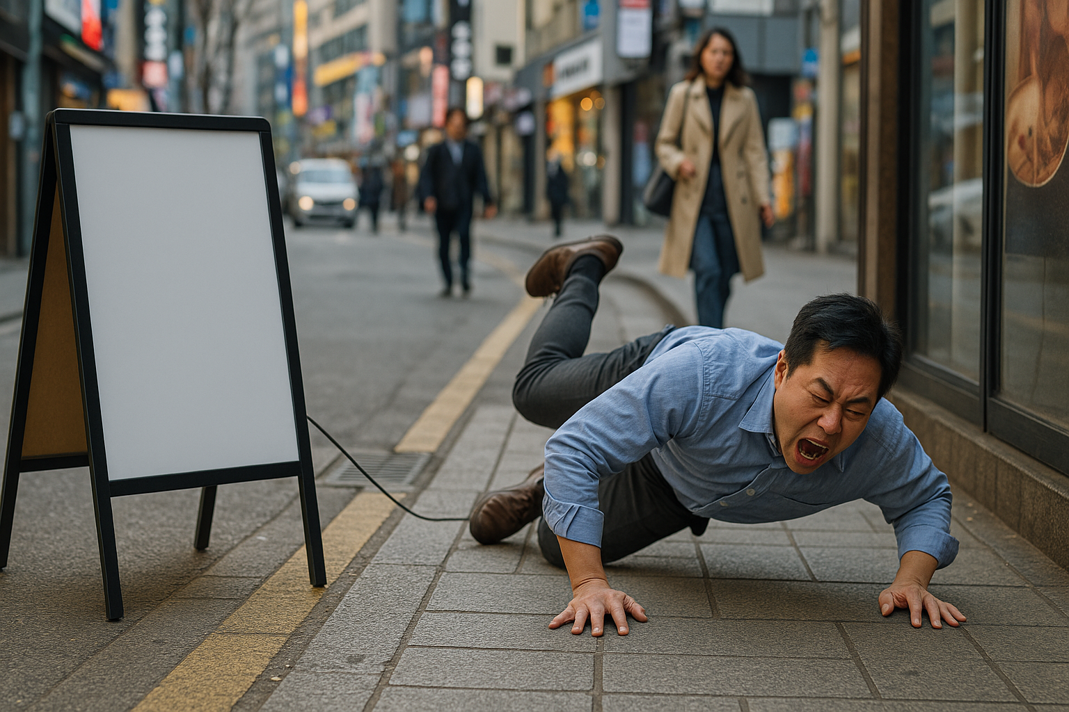 서울 번화가 인도에서, A씨(가명)가 카페 입간판에 연결된 전선을 밟고 넘어져 큰 부상을 입은 사고가 발생했습니다. 전선이 인도 위에 느슨하게 놓여 있어 보행 장애를 유발했고, 넘어지면서 손목 골절 및 타박상 등의 상해를 입은 A씨는 가게 주인을 상대로 손해배상 소송을 제기했습니다.
